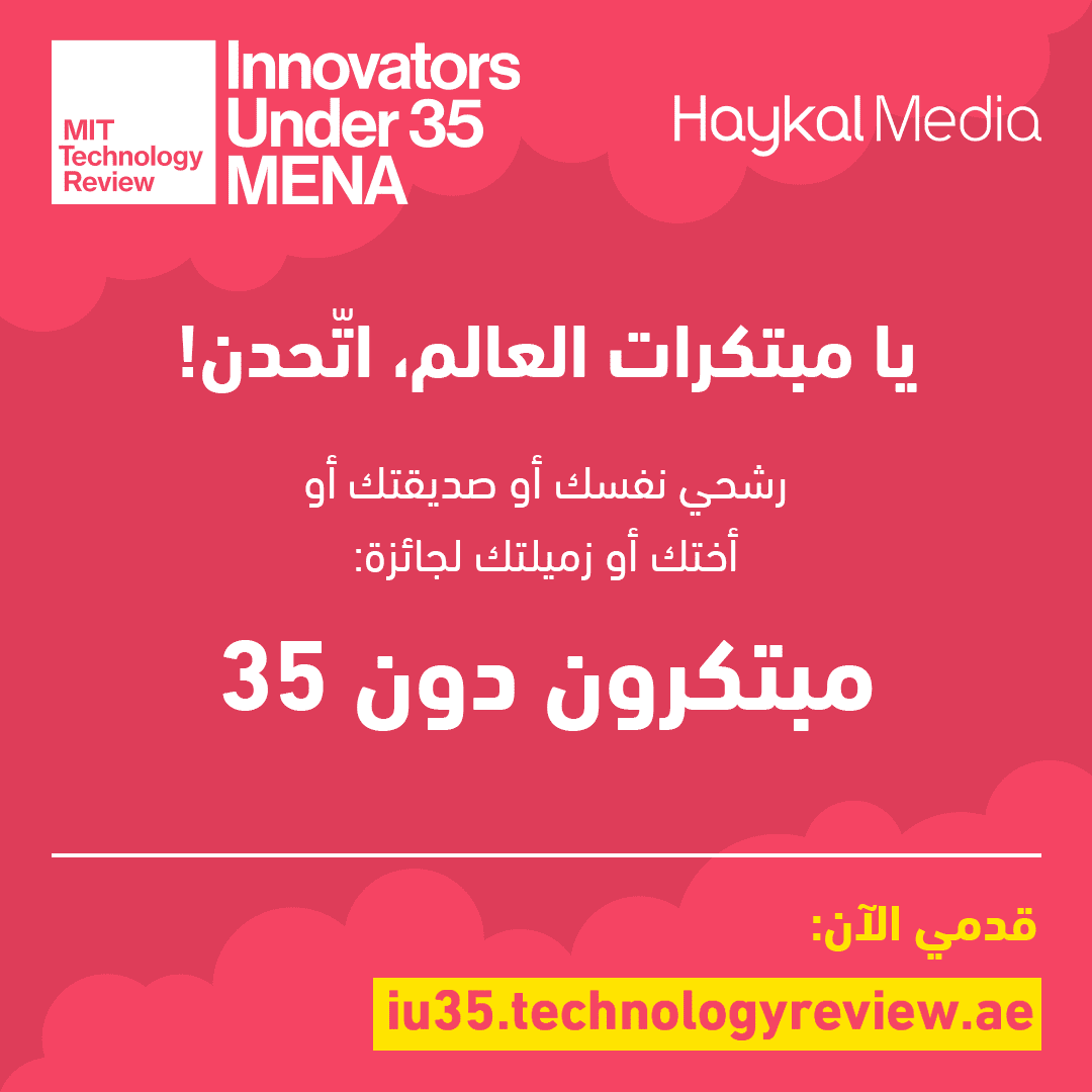 نداء إلى المبتكرات حول العالم، رشّحي نفسك أو إحدى اللائي تعرفينهن لجائزة مبتكرون دون 35 العالمية؛ لتوسعي دائرة النساء ذوات الابتكارات المؤثرة على حياتنا. إليكِ نموذج الترشح في هذا الرابط: