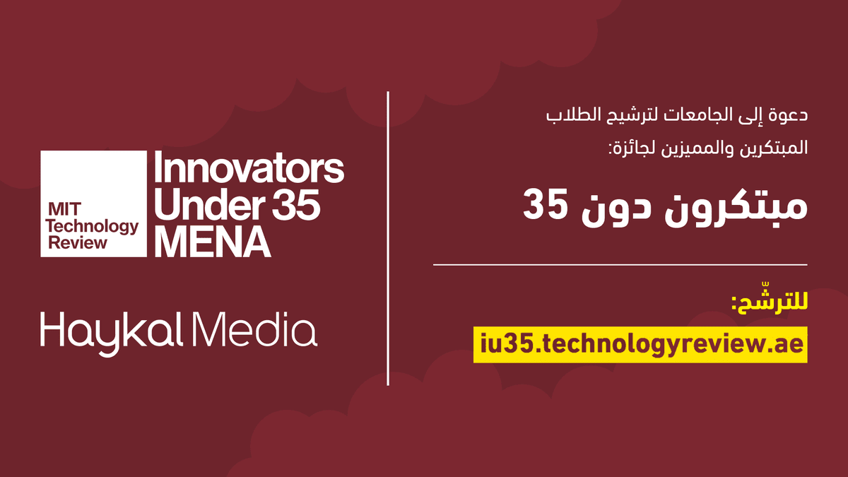 ندعو الجامعات حول العالم إلى ترشيح الطلاب المتميزين ممّن لهم ابتكارات تقنية فريدة لجائزة #مبتكرون_دون_35 العالمية من إم آي تي تكنولوجي ريفيو، عبر الرابط التالي: