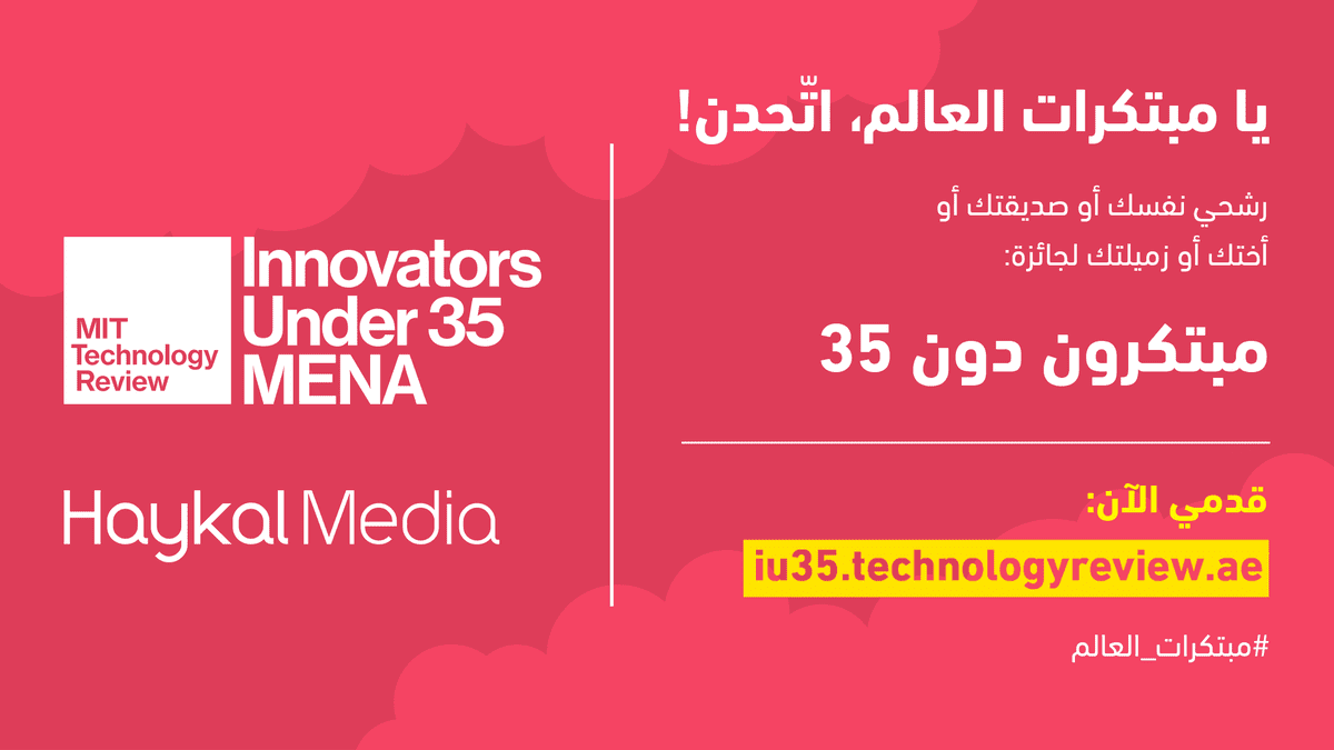 نداء إلى المبتكرات حول العالم، رشّحي نفسك أو إحدى اللائي تعرفينهن لجائزة مبتكرون دون 35 العالمية؛ لتوسعي دائرة النساء ذوات الابتكارات المؤثرة على حياتنا. إليكِ نموذج الترشح في هذا الرابط: