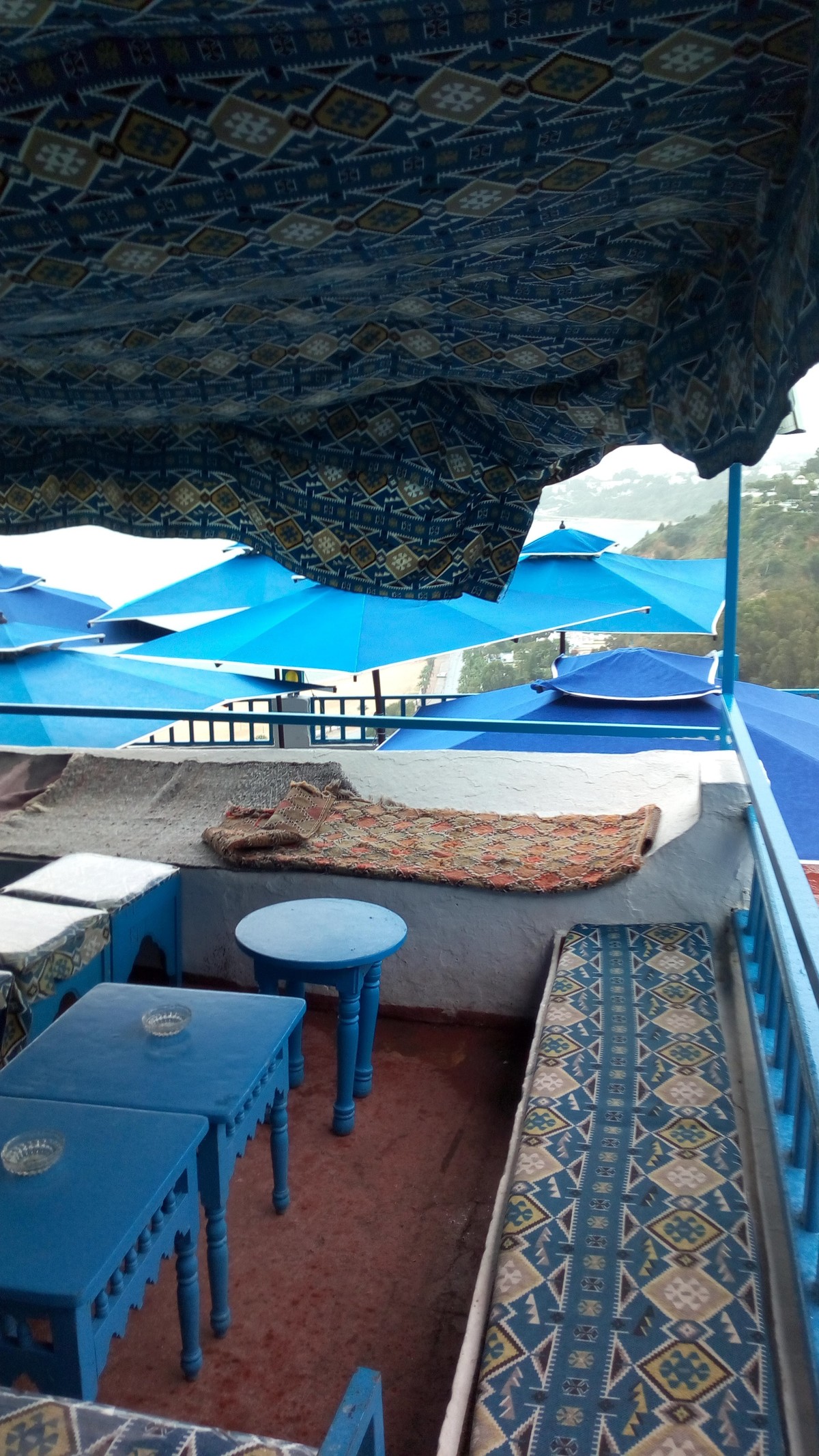 هو شعره طويل جدا ومن أجل إلتقاط صور في ذلك المكان قام بوضع البروتيين أو الكيراتين لا أعلم كثيرا حول مواد التجميل التي لا تتحمل المياه فقد سمعت الكثير من الشتائم لكن الأمر يستحق أن تتبلل و تراقب سقوط قطرات المياه فوق الأغطية الزرقاء مع بخار القهوة و الهدوء الذي يعم المكان بسبب غياب السياح.
