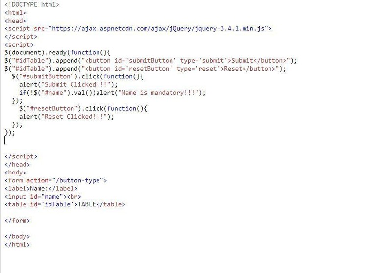 $(document).ready(function(){ $("#idTable").append("<button id='submitButton' type='submit'>Submit </button>"); $("#idTable").append("<button id='resetButton' type='reset'>Reset </button>"); $("#submitButton").click(function(){ alert("Submit Clicked!!!"); if(!$("#name").val())alert("Name is mandatory!!!"); }); $("#resetButton").click(function(){ alert("Reset Clicked!!!"); }); }); Name: TABLE