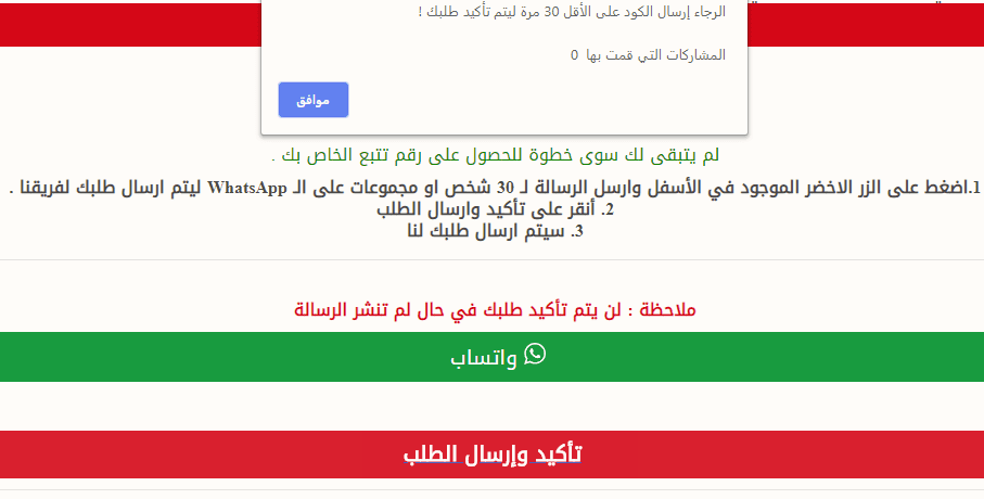 كنت عايز اعمل عندي في المدونه مسابقه و المسابقه دي يكون فيها شرط ان عشان تكمل المسابقه لازم تبعت رساله ل 30 شخص عندك على الواتس والموقع يتاكد انك بعت الرساله دي الى 30 شخص زي ما هو واضح بالضبط في الصوره دي: