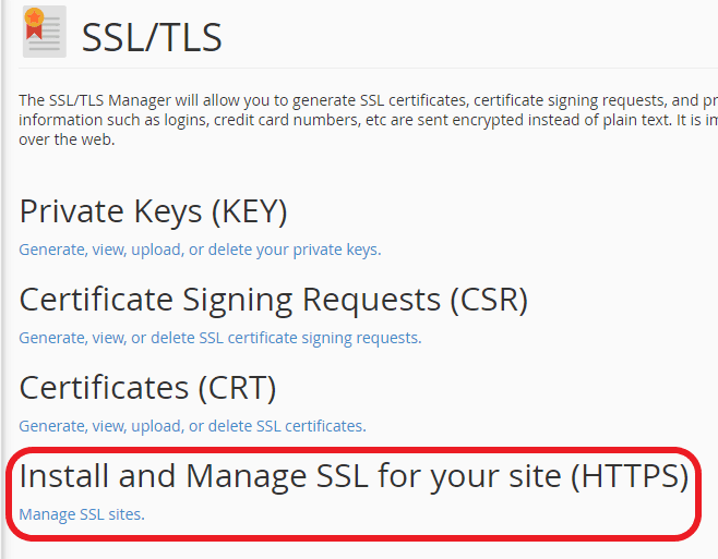 الخطوة 5: ارجع إلى القائمة السابقة. انقر فوق إدارة مواقع SSL من ثم Install and Manage SSL لموقعك (HTTPS).