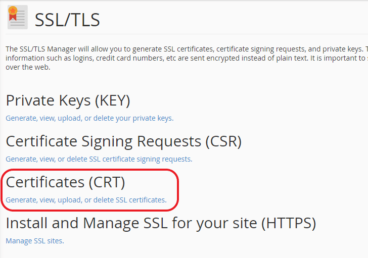 الخطوة 3: انقر فوق إنشاء أو عرض أو تحميل أو حذف شهادات SSL تحت الشهادات (CRT)