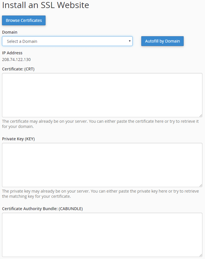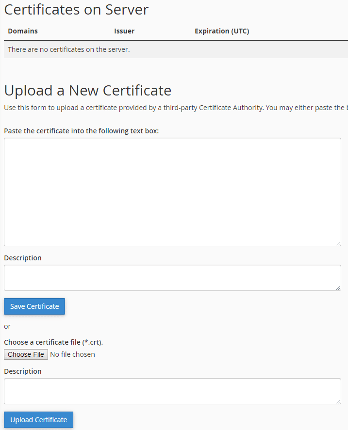 الخطوة 4: في حقل تحميل شهادة جديدة، انسخ والصق الرمز من ملف * yourdomain * .crt ، والذي من المفترض أن تستلمه من Comodo CA في رسالة بريد إلكتروني.