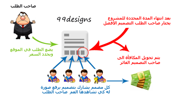 لا أنصحك به لو كنت فقط في بداياتك ك designer ومحتاج للربح في الوقت ذاته لأنك ستجد الكثير من المنافسين المحترفين هناك والسبب في قولي لك هذا أن 99designs يعتمد على أسلوب المسابقة. وبتفصيل أكثر ما يجب أن تعرفه أولا هو أن هذا الموقع مخصص للتصميم فقط. ويتم عرض طلبات عليه من طرف عملاء يحتاجون الى تصميم واجهة موقع أو شعار أو غير ذلك. يشرحون المطلوب من المصمم والسعر الذي سيدفعونه لقاء التصميم وآخر أجل لقفل الطلب. ويتم ذلك عبر مسابقة تقوم على المنافسة. كل مصمم أراد الفوز بالمكافأة التي حددها صاحب الطلب يصمم ديزاين ويضع صورة له على الموقع. بعد انتهاء الفترة الزمنية للمسابقة يختار صاحب الطلب أفضل تصميم ويتم تحويل المكافأة الى الفائز مثال: