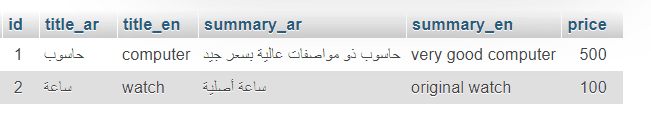 لاحظ أننا أضفنا اسم اللغة كلاحقة لكل من ال summary وال title وهكذا ببساطة يمكنني عند جلب هذا السطر القيام بشيء مشابه لهذا :