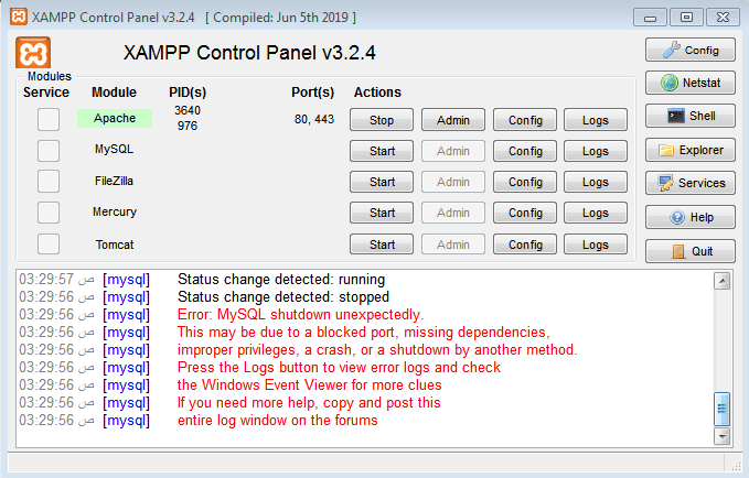 *نقوم بإعادة تشغيل المخدم Xampp من لوحة التحطم الخاصة به