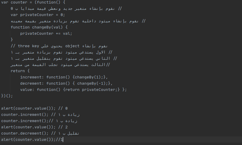 ١. إخفاء تفاصيل التفيذ في لغة جافا سكريبت أو بمعني اصحي تعريف private ميثود او متغير داخل ميثود أخري . يمكن أن تجلبه فقط داخل مكان التعريف .