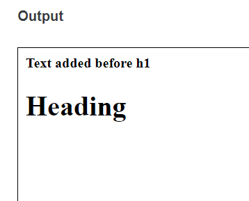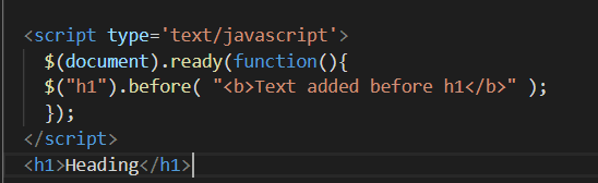 $(document).ready(function(){ $("h1").before( "Text added before h1" ); }); Heading