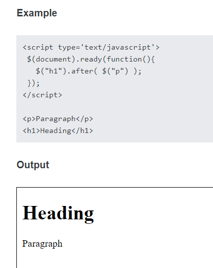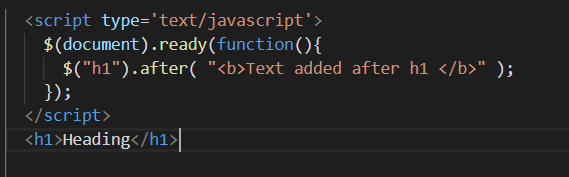 $(document).ready(function(){ $("h1").after( "Text added after h1 " ); }); Heading