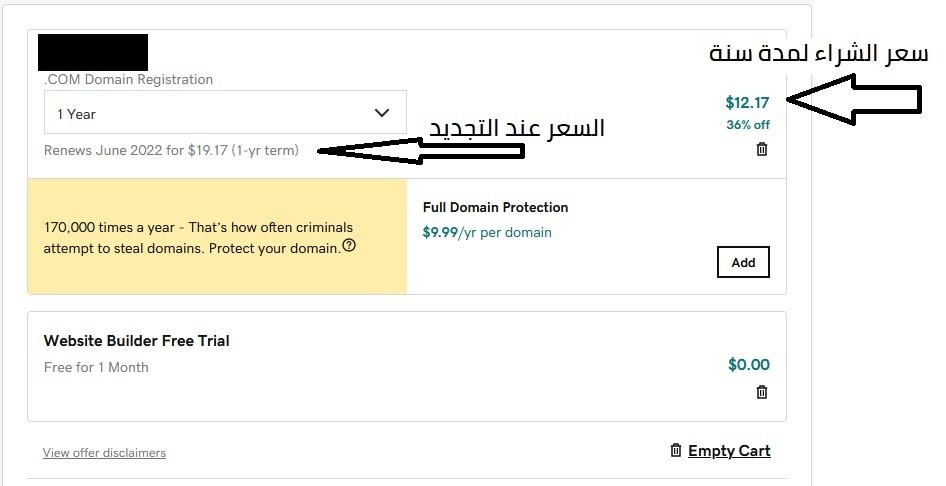 اما بخصوص الدومين فعادة تكون سعر الشراء الأول مخفض كما في جودادي ولكن عند تجديد الدومين ذو امتداد com فإن سعر التجديد يكون تقريبا 19.17 دولار امريكي(لاحظ ان الأسعار قد تتغير فيما بعد) ولكن يخبرك مقدم الخدمة عندما تريد شراء الدومين ان سعر التجديد سوف يكلف القيمة الفلانية كما في الصورة ادناه وان اسعار التمديد تختلف حسب امتداد الدومين.