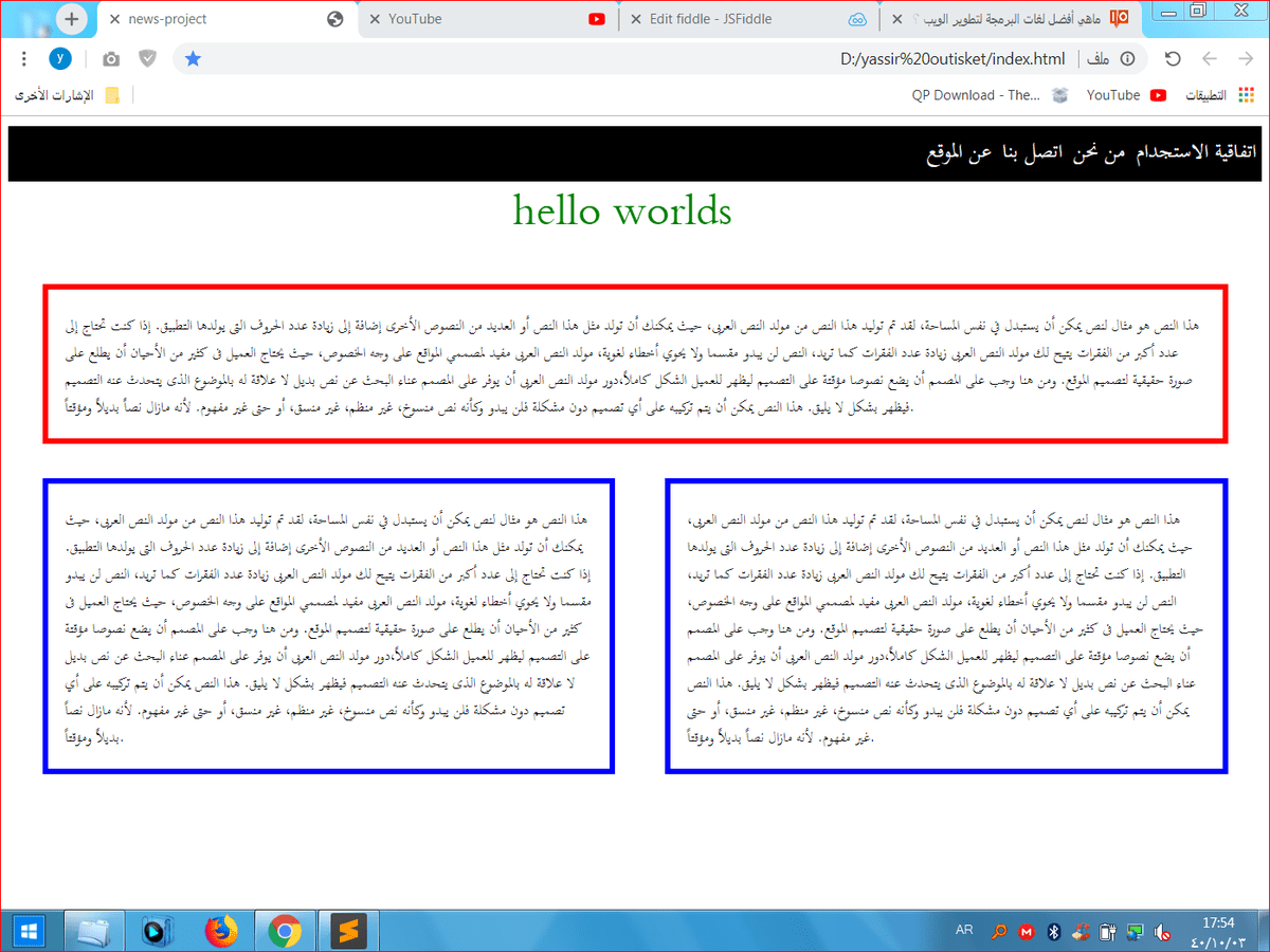 رائع , أنت في الطريق الصحيح , إستمر , جرب في كل مرة إضافة شيئ جديد للصفحة و قم ببنائها و عدل عليها حتى تصل لمرحلة إنشاء صفحة كاملة فيها كل العناصر الأساسية لصفحة حقيقية .. و لا تنسى إطلاعنا إلى أي مرحلة وصلت فيها في التكويد لكي ننقدك هههههه